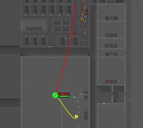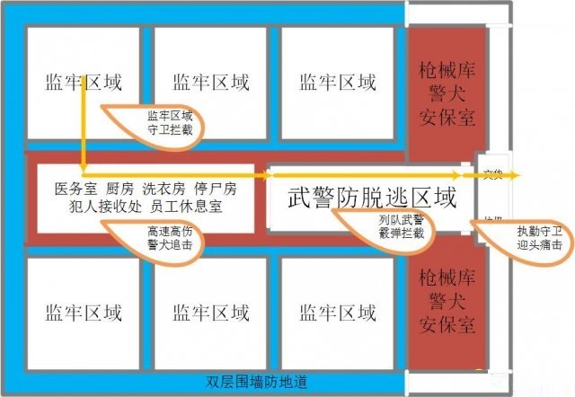 安保室是闲时守卫聚集区,犯人从左往右逃,守卫从右往左冲,有效防止追不上。
