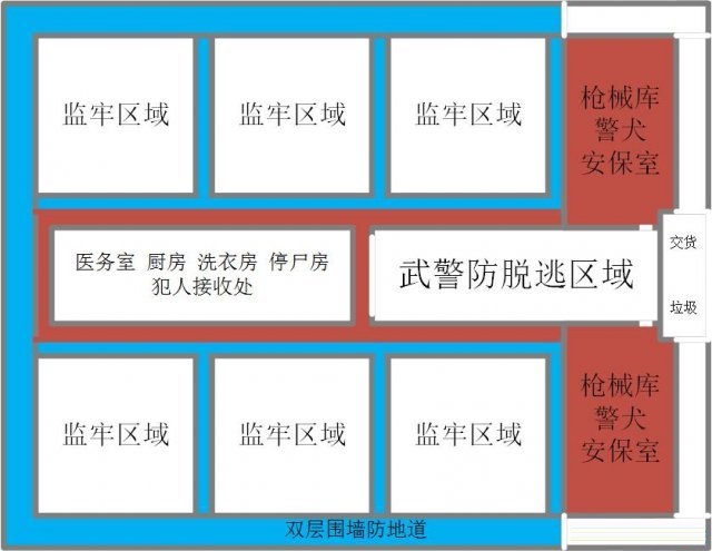 武警防脱逃区后加多道遥控门更佳,配合武警防脱逃区右墙上安装遥控门(实际上是射击口),可以在拦住囚犯一段时间,让他们好好尝尝霰弹的滋味。另外你可以像我一样把犯人接待处划在右边2x4的区域里。