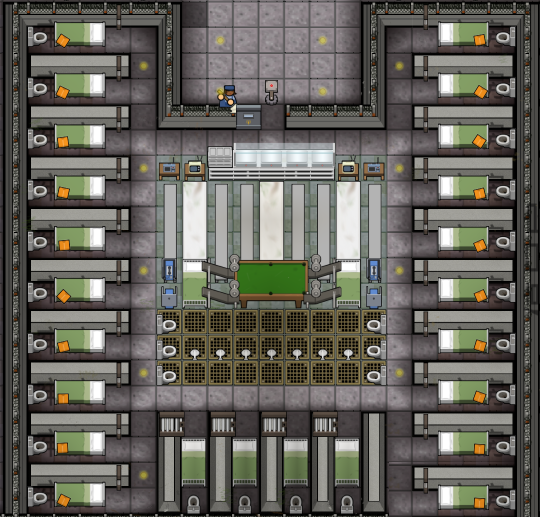 每个监牢区域是犯人唯一的活动区域,我的作为例子,至少有一个食堂,别的请随意。门口使用遥控门,防止抢钥匙导致加快逃跑。(我的律师解锁了1x3小牢房)