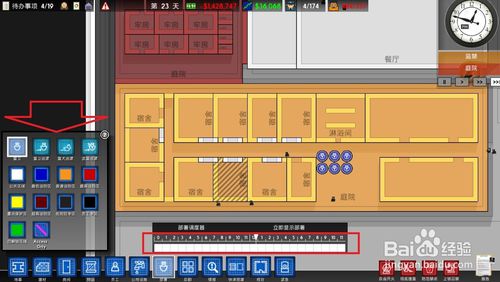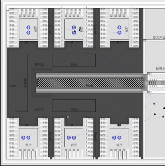 之后先在地图上画出两大房间,中间互相留走道两边不互通,两边房间都设定安保防区,一边只收中等安全犯人,另一边只收最高安全犯人,然后在两边区域都可以到达的地方建立一个庭院,这时庭院就是中立的区域了,因为警卫也会去占领中立区域所以建立巡逻路线将警卫摆上省的犯人还没占地盘警卫就占走啦。