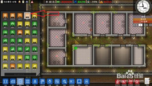 等宿舍牢房建设完毕后,就去【房间】里找出宿舍,再在规划好的牢房里拉上宿舍房间,如图。