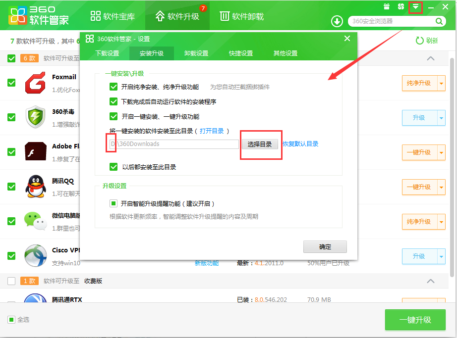 2、单击“安装升级”,直接修改盘符、或单击“选择目录”修改一键安装的默认安装目录;
