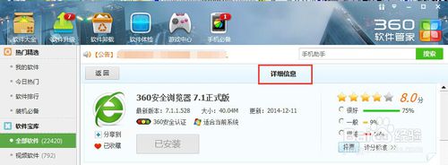 在软件管家界面左侧栏点击【全部软件】,双击右侧需要收藏的软件,打开软件的详细信息界面,如图所示: