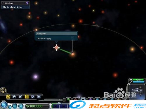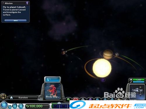 通过收集按钮(黄色箭头所指示的)可以查看自己的任务目标以及勋章收集状况。滑动鼠标滚轮使飞船飞向恒星系。飞向Calceall星球,用鼠标左键点选该星球即可前往。