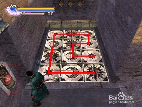 进入之后左边的宝箱得到“圣米歇尔山的地图”用炎蛇剑将花园4个的火炬点燃得到“大门的键”在钉子快到最高处按三角可从里面出来