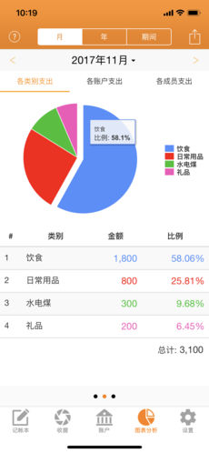 类别占比,成员占比,收支趋势等图表功能,把您的收支状况呈现得明明白白,清清楚楚。
