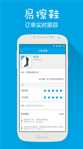 易擦鞋结合互联网,为用户提供一种更便捷、更高品质的鞋类洗护服务。通过APP下单,免费上门取送,5日内送还,节省了用户的时间和精力。通过现代化的管理和设备,将传统鞋类洗护行业标准化、流程化,每双鞋从收送到洗护,均是独立包装,独立洗护,并根据材质使用不用的洗护方案。目前服务内容包括鞋子的清洗、保养、维修、翻新等。收费透明,客户可根据自己需求自由选择。