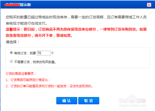 选择购买数量超过商城当前的库存数量时,会有提示框弹出进行提示,此时你需要再次确定是否需要这么多的元器件数量。