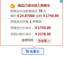 二次确认数量后会有提示已放入购物车等待结算