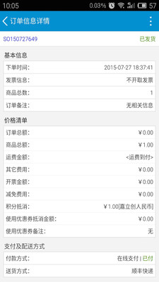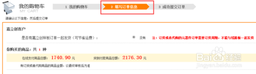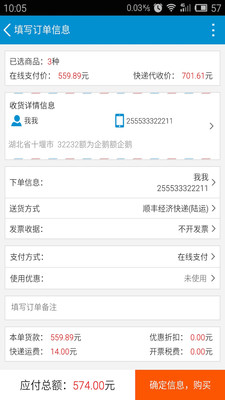 然后在填写订单界面中,填写好发货信息和快递方式等内容,然后点击提交按钮