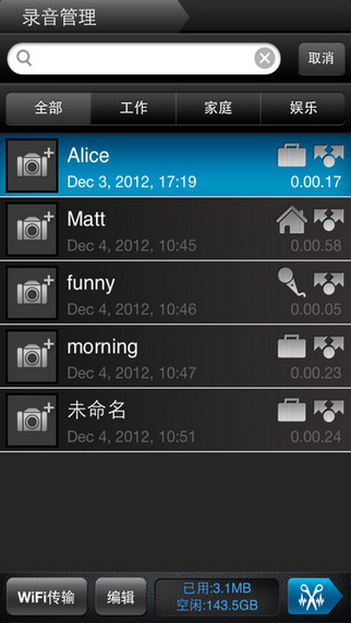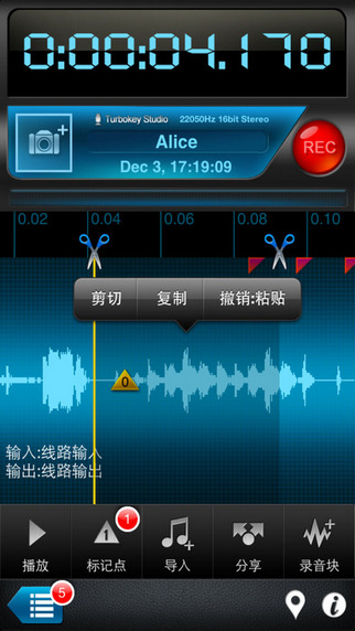 易于回放:支持Airplay,可使用蓝牙音箱回放,0.5,1.5, 2倍变速播放,。快进,快退,循环播放控制易于管理:从标记点列表中选择标记点可以快速定位及重听,可以给标记附加图片和文字说明,录音可分类管理,可以给每个录音附加图片和文字说明,除了录音时增加标记点,也可在录音完成后增加标记点和注释。