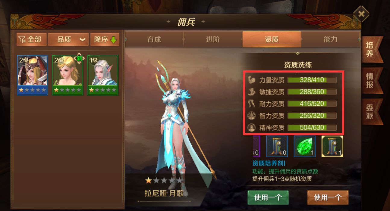 查看佣兵当前的资质和培养佣兵资质,资质越高,对应的属性成长值越高。