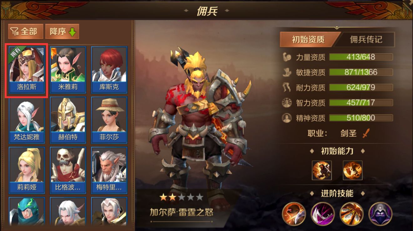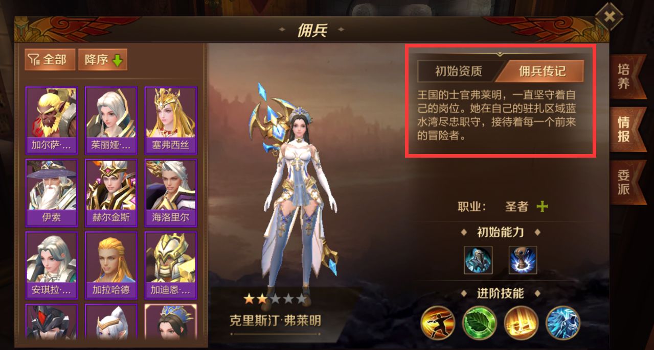情报板块用来浏览全部佣兵的信息,查看佣兵的初始资质、职业、技能、能力等,已拥有的佣兵会标明“拥有”。