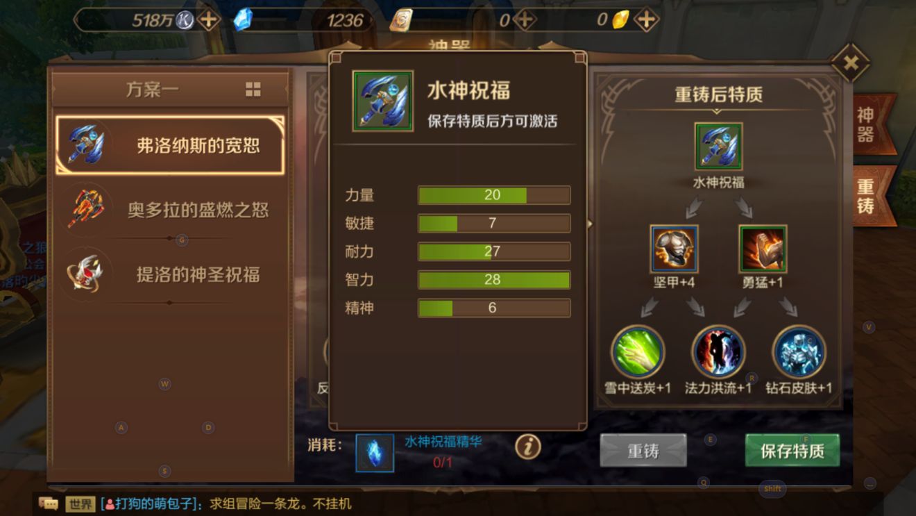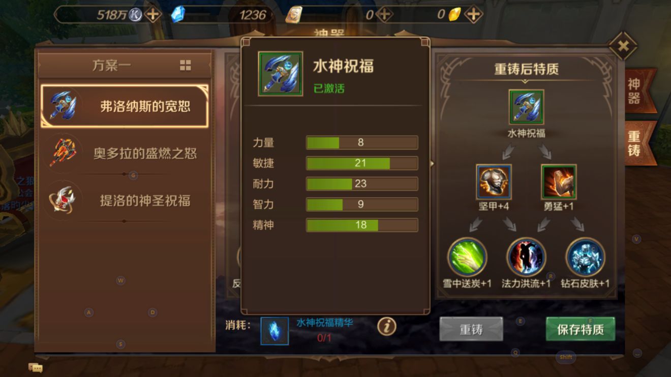 神器重铸的作用不但可以为只能点1级的某些天赋提供额外的天赋升级点数。还能提升大量基础属性。通过消耗祝福精华,我们可以重铸神器的特质,神器只能按箭头选择一个特质路线。水神祝福精华通过王者地下城和公会商店获取。两个水神祝福精华可以通过合成生成一个火神祝福精华,两个火神祝福精华可以合成一个光神祝福精华。