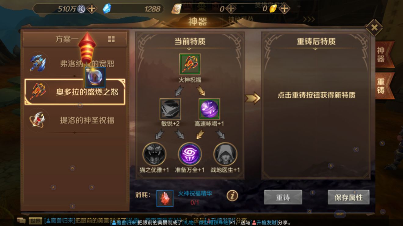 每次重铸都会生成两个两个基础天赋和三个高级天赋,然后点击“保存特质”就可以完成一个神器的替换,此时并没有完成神器重铸,因为属性还没有选择提升。选择后会有激活提示,一旦激活将无法更改,除非再次重铸,再重铸可就不一定会出理想的天赋了。