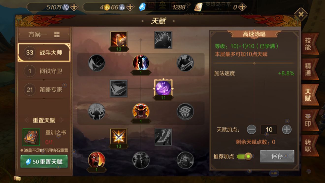 2. 从天赋中选择对自己职业加成最重要的几个天赋技能,例如霜语者的高速咏唱