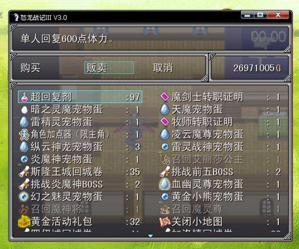 《怒龙战记3》是一款国内制作的一款rpg游戏,属于踩地雷式遇敌,画面还是相当精致的,系统的复杂度和完成度相当高,超丰富宠物神兽系统,超炫发光神器,人物二转系统,钓鱼场系统,打礼包系统,挑战BOSS系统,赌博系统和传送系统,游戏的耐玩性非常高。游戏中所有怪物都有可能成为你的宠物的,要靠打出该怪的宠物蛋,孵化出才可以,宠物成长和技能都不一样,越往后面的怪物,则它的宠物就越强,宠物有9个系,天使,火,土,风,冰,雷,魔兽,小魔兽,战士兽,普通宠物,其中天使系最强,普通宠物系最弱,除了普通宠物,每个系都有各自的技能,而且可以带装备。另外,游戏还加了特殊宠物装备,城市传送石,冒险地传送石,游戏的探险模式,在地图上寻宝,很多隐藏任务,等等啊,每种怪物都有几率出自己的宠物蛋,BOSS也有几率出自己的宠物蛋,还有超多发光装备,很炫的哦,技能很炫的,还有转职系统,游戏刚上来是初学者,打到转职证明可以转成很多职业,目前职业有牧师,法师,剑士,魔剑士。其中牧师最强的。