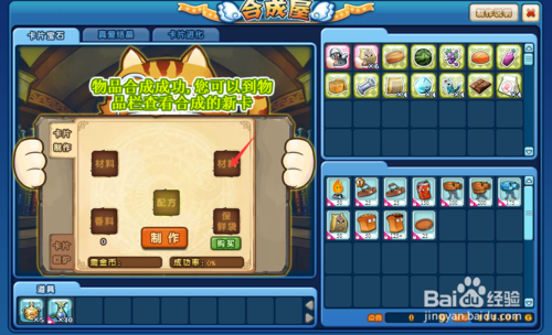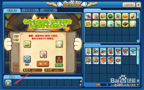 4、对于绑定的材料道具,我们可以在游戏首页点击“合成屋”,进入到道具合成页面,在合成页面,我们可以将绑定的道具直接移动到材料栏使用。