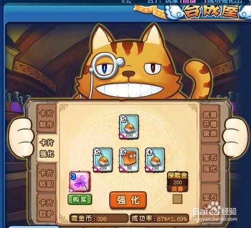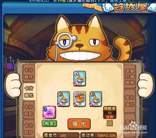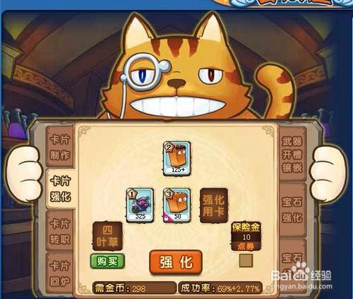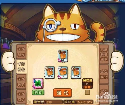 一张被强化卡片,三张7星卡片,一张4级四叶草,保险金。