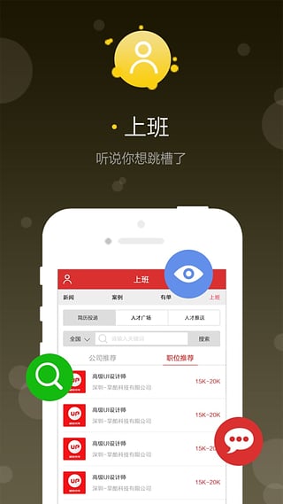 4.上班可以帮助品牌、互联网、广告、公关、媒体等行业内的各方企业迅速精准找到需要的创意、营销等人才。