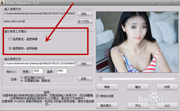 5、接下来有一个超分辨率模式,如果你的电脑配置还行的话,选择上面的质量优先模式,否则选择下面的速度优先。这是视频处理过程的不同插值计算方法。