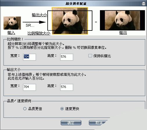 7、再下面的帧大小就是分辨率的设置,不同的文件需求,要设置不同大小。注意要设定合适的比例,否则画面会变形的,如果你不知道比率,可以使用高级模式(主界面的右边部分,左边下面的简单模式与高级模式转换按钮),选择超分辨率,如图,有一个“保持纵横比”,勾选。