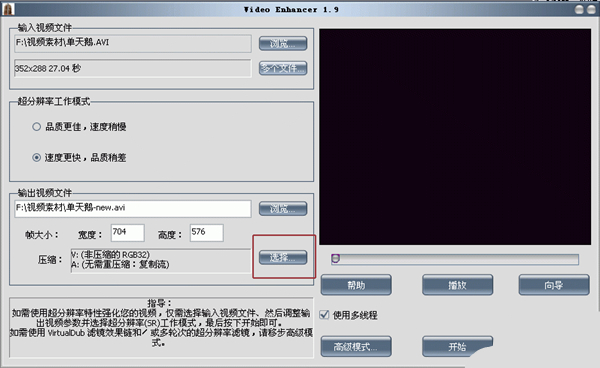 然后再选择帧大小,选择压缩类型,就可以点击开始了。等待软件处理完毕,可以点击预览,觉得满意就可以保存了。