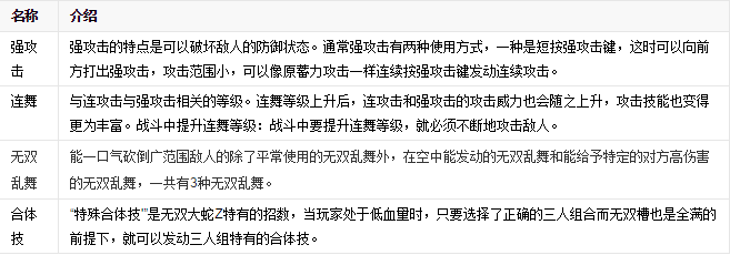 技型武将:可以使用消耗无双的EXC技。使用方法是把原来按蓄力键换成按R1键,例如EXC3就是方+方+R1。EXC技速度快,攻击力强。有一招Rk技与Ck技完全不同,称为EX技或SP技,一般为R1。自带可跟武器叠加的破天,伤害加成40%,鸡肋(1代是90%加成啊),才这么点,不如用冰。技型在1代特别强势,所以在Z大幅削弱实属正常。