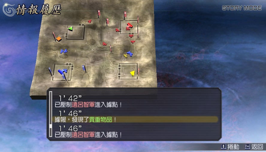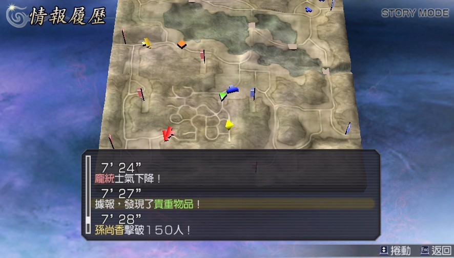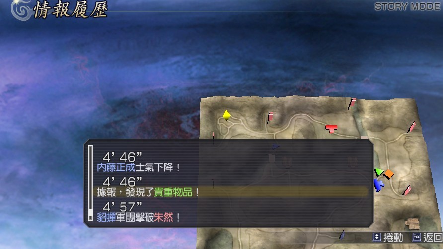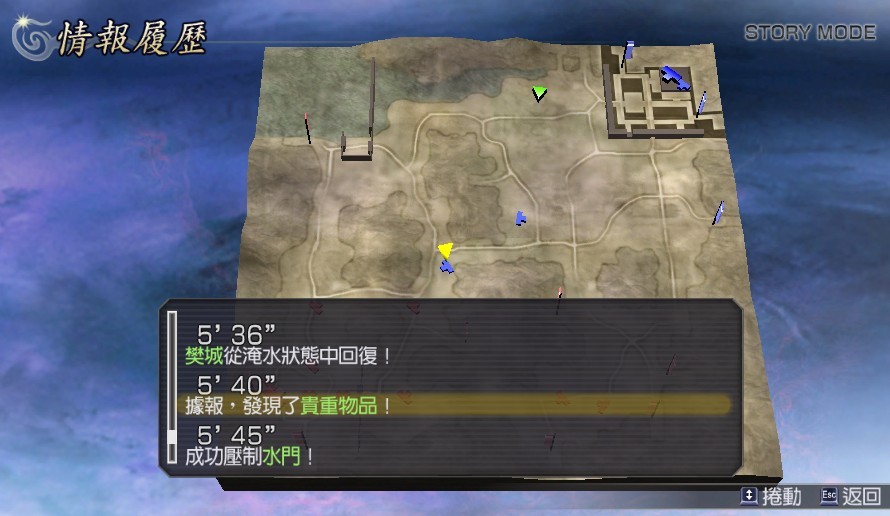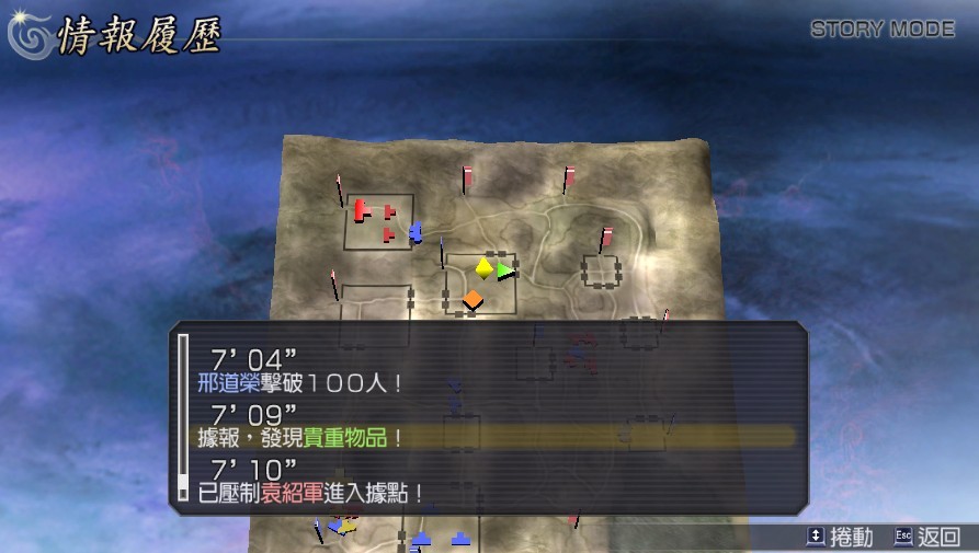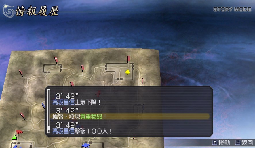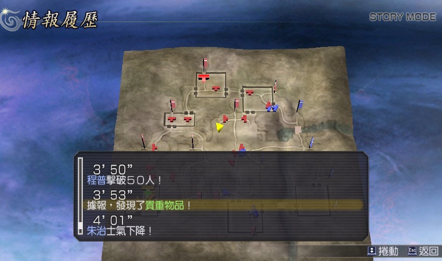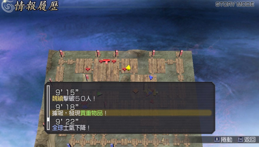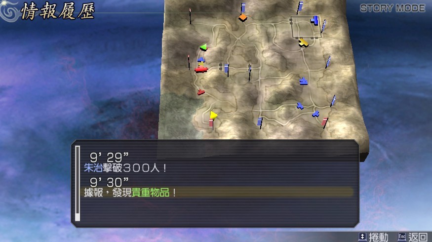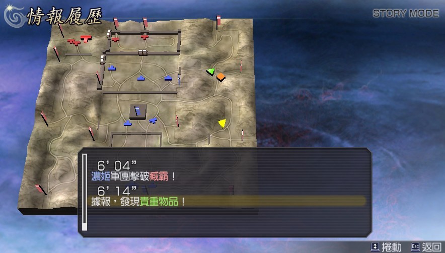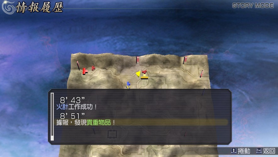 流程:开始后5分钟内停止全部3处大筒(以出现“全部大筒停止”的信息为准),之后玩家亲自击破前田庆次和妲己,简单来说,ㄧ开始就不要管中央的敌人,直接去压制右下角的炮台,之后顺那条路往上压制,就可以轻松压制3炮台,之后去KO掉妲己,庆次会以伏兵身分出现在本阵,再回头KO他,贵重物品讯息出现 ,这关本人实践也是5分钟,完成不了的话,还是去设定吧。