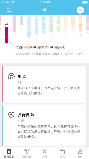 ·「家族对比」:与家人一起进行基因检测,轻松创建家族遗传树?,家族遗传情况一图看清;·「探索祖源」:探索自己的民族血统,追溯祖源迁徙之旅,记录自己的祖源故事;
