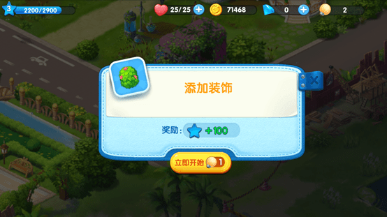 游戏主界面的右下角是消除模式的入口,大大的数字指的是我们当前通关关卡数.建设庄园所需要的灵感就来源于消除关卡的通关奖励.当一个新关卡首次通关时,我们会获得100灵感和5体力.这也是当前版本灵感的唯一来源.除此之外还会获得获得数量不等的金币,一般为400-700左右,视通关优秀程度而定.