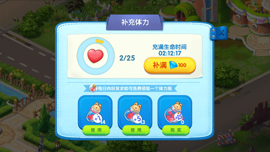我们在完成新手教程后会获得一个小时的无限体力时间,这是前期冲关并赚取灵感的重要途径,一定要合理利用.一般借助这个无限体力时间能冲到40关左右.无限体力时间结束后就开始消耗体力了.体力上限是25点,每6分钟恢复1点,150分钟回满.如果想要快速回复体力,就需要体力瓶了.