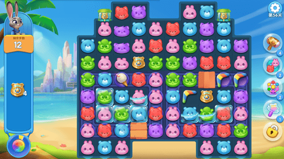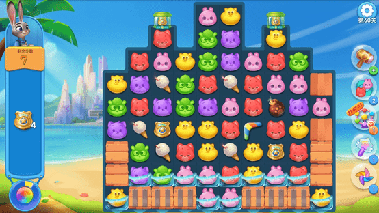 与传统的消除游戏类似,在这里组成三个及三个以上颜色的棋子就能进行匹配消除.消除界面左侧有一个本子,本子上面显示的是当前关卡的收集目标,完成收集目标即可成功通关,如果在限定步数内没有完成收集目标则判定通关失败.
