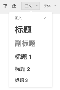 在文档里选中相应的内容标题后,点击文档左上方设置目录的按钮(正文),即可完成文档目录的设置。目前有「 正文 」、「 标题 」、「 副标题 」、「 标题1 」、「 标题2 」、「 标题 3」五种目录选项,如下图所示: