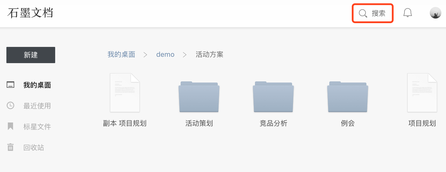 在石墨桌面右上方有一个「 搜索 」按钮(见下图),点击后即可进行文档搜索。