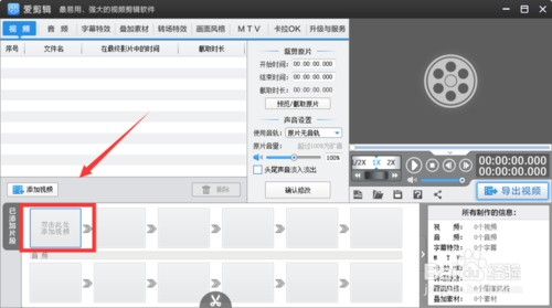 1、打开爱剪辑软件,进入视频界面后,在音频栏双击鼠标左键添加视频。