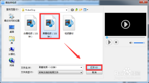 2、根据个人喜欢选择视频,沫沫在这里选择的是黑幕视频,点击【打开】。