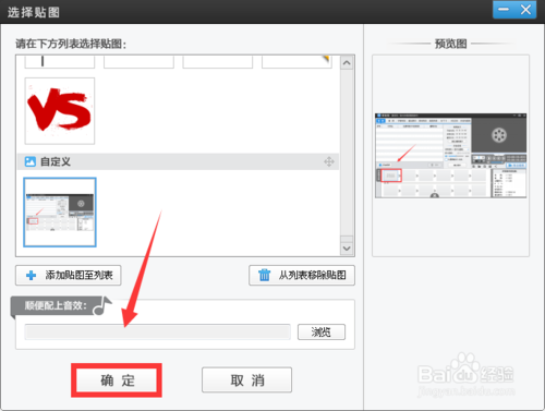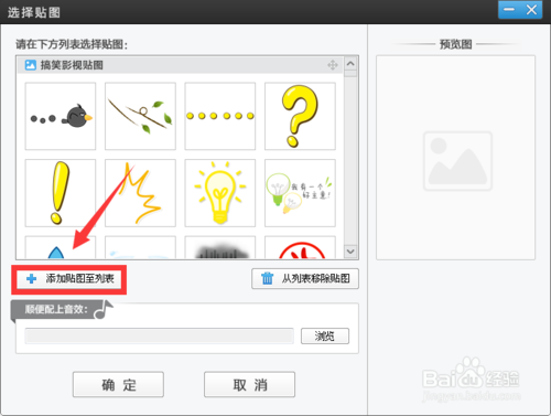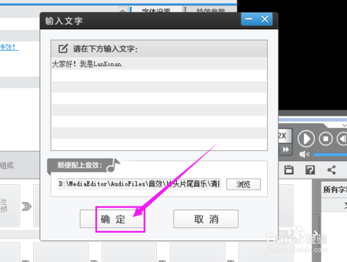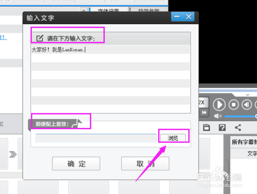 5、在弹框中,输入文字。即具体的字幕。然后在添加音效(即与文字对应的录音,录音大家可以先用手机录好,再传到电脑上来),即点击【浏览】。