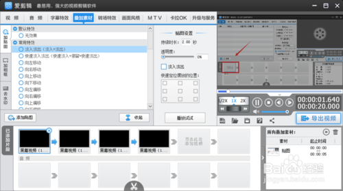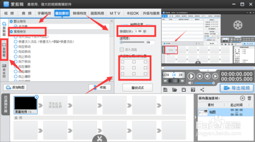 7、接下来我们可以对贴图的持续时长、摆放位置、常用特效、相框等进行设置。