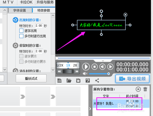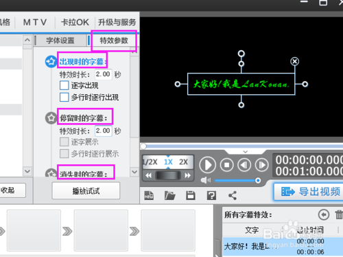 9、点击【特效参数】,可以设置字幕出现、停留和消失的时间。默认情况下是每种两秒,所以字幕的总时间就是6秒。具体时间大家根据字幕的长短做适当调整,字幕长时间就设置长一点。