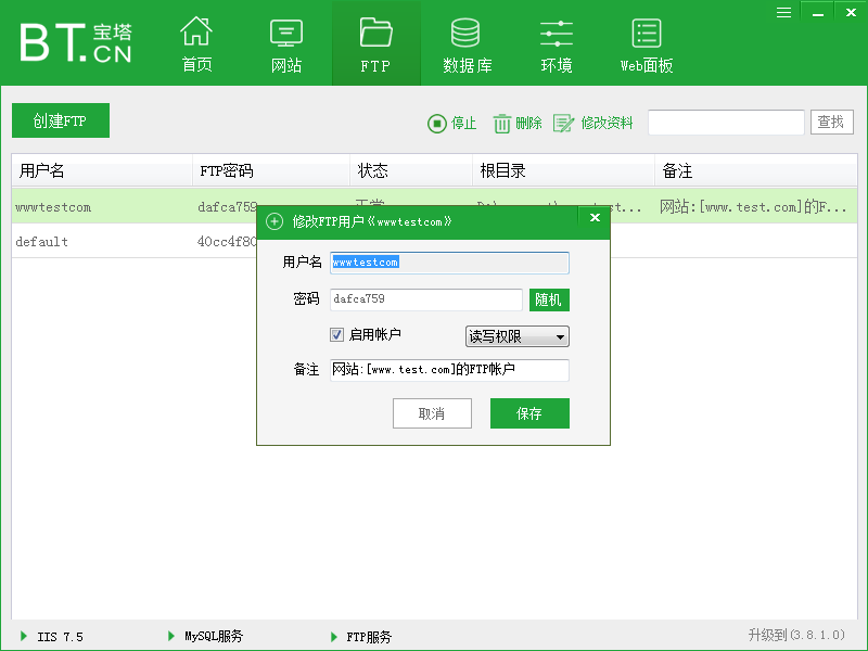 (3)同步FTP、停用FTP、启用FTP、删除FTP