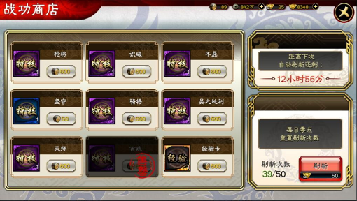 累计获取的战功,可以通过“战功商店”购买心仪的蓝色/紫色武将特技卡,可以传授给自己武将,让武将战力得到进一步提升!同时还有几率刷新出橙色武将经验卡,一张橙色武将经验卡可以给武将带来非常可观的经验值,千万不要错过!?
