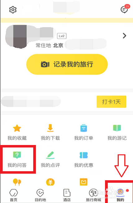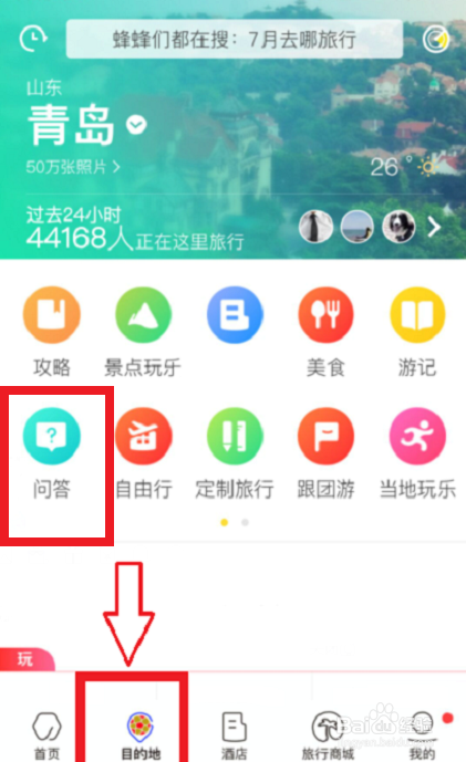 进到马蜂窝的起端页面时,在最底的白框可示露出‘目的地’的圈钮,按下这并从上栏点‘问答’的蓝标。