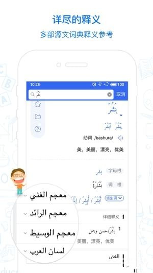 阿语词典资料方面兼顾日常生活,科研,医学,历史,文化,艺术,天文,地理,等多个学科的专业词汇同时吸收了阿拉伯方言词汇及现代网络流行词汇。