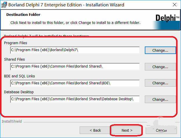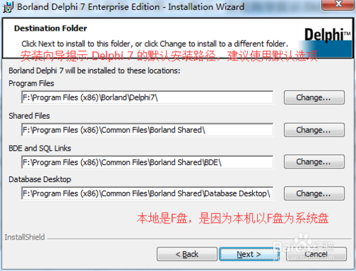 安装的过程中,安装向导提示 Delphi 7 的默认安装路径,可以点击“Change”按钮可以选择安装目录,也可在编辑框中直接输入,建议采用默认路径,另外,由于在卸载 Delphi 7 时,会用到“安装数据库”,所以建议选择此项