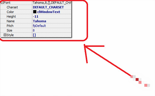 Font属性也是VCL类的一个实例,字体包括字体名称、颜色和字体大小等内容。注意在属性Font前面有一个加号,这表示这个属性有一些可分别设置的子属性。双击Font属性名,就会扩展开来,如下
