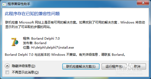 下载并打开delphi安装包和序列生成器,双击delphi,开始安装,一开始会弹出“程序兼容性助手”的提示框,选择忽略它,让其不再出现