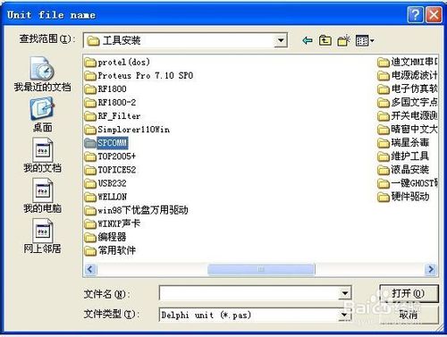 先准备好串口控件SPCOMM,我把它放在F盘的工具安装文件夹下,等一下加载时需要用到。