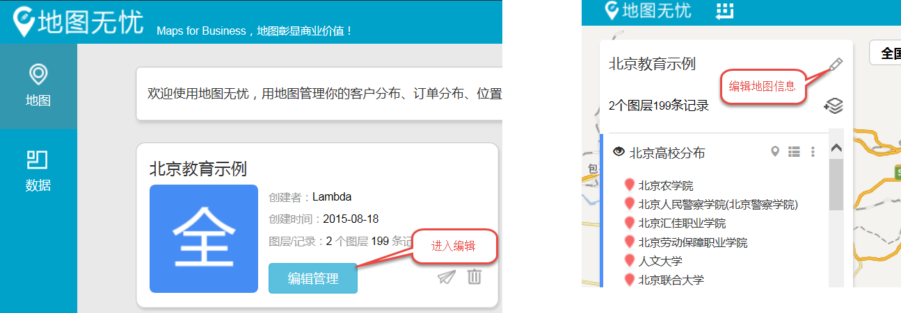 点击地图列表中的“编辑管理”进入编辑;打开地图后点击“编辑”按键,开始编辑地图信息;