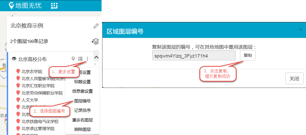 在图层列表中选择想要使用的图层,如北京高校分布图层,点击该图层的「更多设置」按钮,选择“图层编号”,弹出“区域图层编号”窗口,复制图层编号,点击关闭。